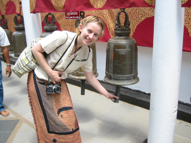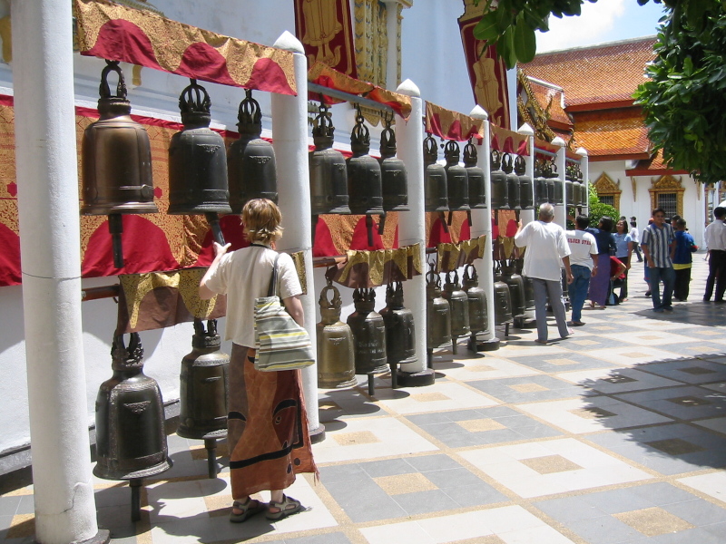 Enough of the elephants. Now we're at the temple (Doi Suthep Wat Phrathat) overlooking Chiang Mai. And Nicole is indulging her bell-ringing habit.