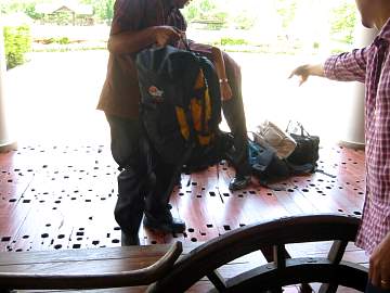 dumping our bags onto a table. | |